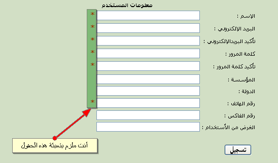 - يتوجب تعبئة الحقول المبينة في الشكل أدناه كاملة، إذ يتم من خلال هذه المعلومات التواصل معك والإطلاع على ملاحظاتك وأية مشكلات تعترضك خلال الاستخدام، وكذلك لعملية تجديد الاشتراك. لذا من الأهمية بمكان إدخال المعلومات كاملة وصحيحة.