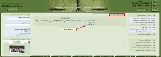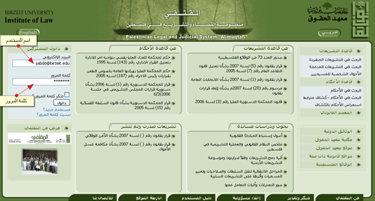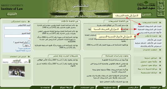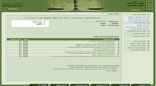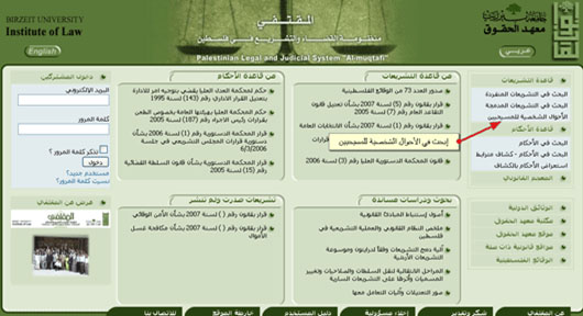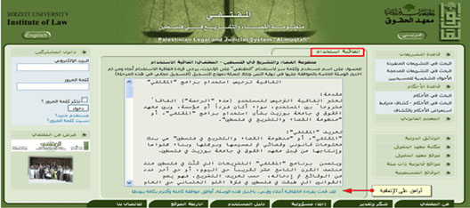 بعد الدخول إلى الموقع الإلكتروني لمنظومة القضاء والتشريع الفلسطيني "المقتفي" على صفحة الإنترنت وهو