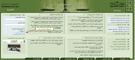 http://muqtafi2.birzeit.edu يتوجب على المستخدم أن يقوم بعملية التسجيل وذلك بإدخال اسم المستخدم وكلمة المرور، وهذه المعلومات يتم تزويد المستخدم بها إلكترونيا عبر بريده الإلكتروني بعد أن يقوم بتعبئة بياناته على طلب الاشتراك وفق النموذج المعد لذلك على الموقع ذاتهوقد بينا ذلك بالتفصيل فيما سبق، وبعد إتمام عملية التسجيل يصل المستخدم إلى صفحة المقتفي التي تتضمن قاعدة الأحكام القضائية وقاعدة التشريعات وأمور أخرى لتحديد اختياره.