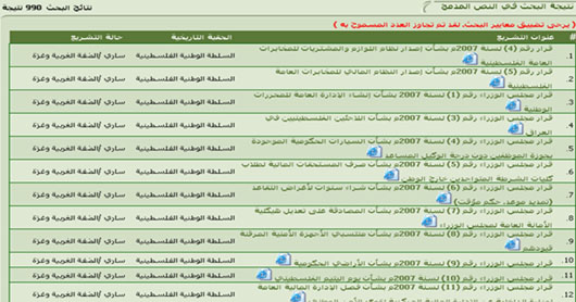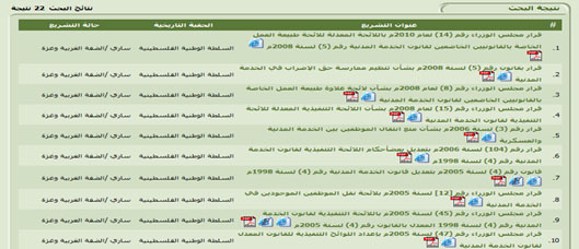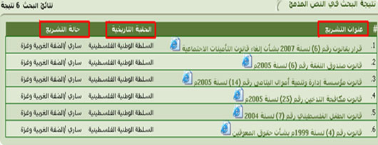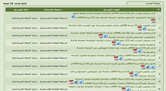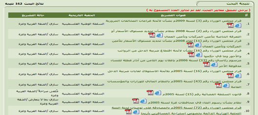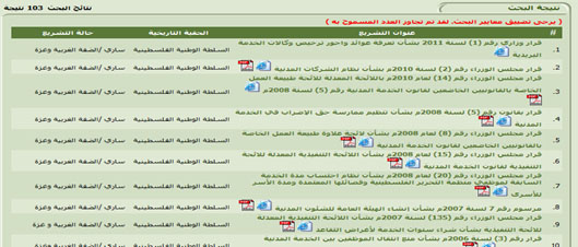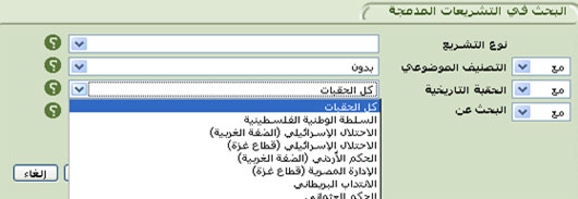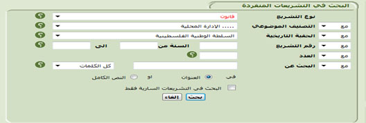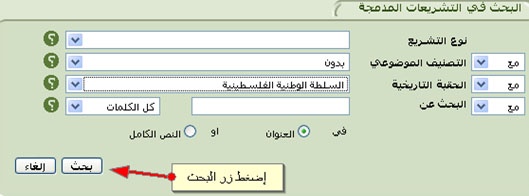 فعلى سبيل المثال، إذا كان المستخدم يبحث في التشريعات الصادرة عن السلطة الوطنية الفلسطينية، فعليه التأشير على حقبة السلطة، ومن ثم الضغط على زر البحث، كما في الصورة التالية: