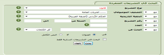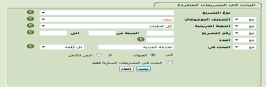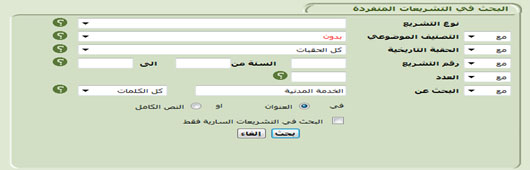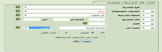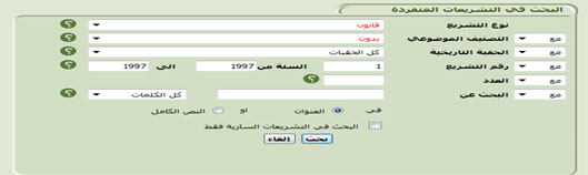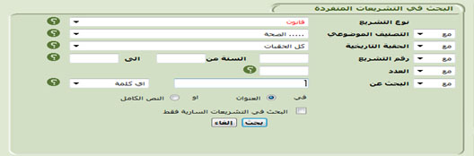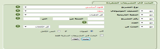 عند الدخول لواجهة البحث في قاعدة التشريعات المنفردة، تظهر حقول تشكل خيارات البحث المتاحة كما في الشكل التالي:
