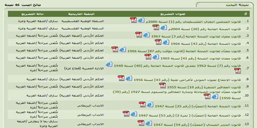 مثال:فإذا تم اختيار نوع التشريع "قانون" من حقل البحث الخاص بنوع التشريع، واختيار "الحريات العامة" من التصنيف الموضوعي، واختيار "الحكم الأردني (الضفة الغربية) من الحقبة التاريخية، ومن ثم الضغط على "بحث"، كما في الشكل التالي: