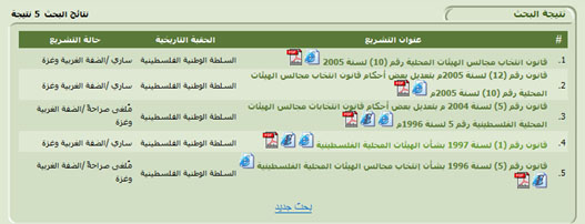 فإذا اختار المستخدم من حقل نوع التشريع "قانون" ومن حقل التصنيف الموضوعي "الإدارة المحلية" ومن حقل الحقبة التاريخية "السلطة الوطنية"، ولم يقم بالتأشير على أيقونة البحث في التشريعات السارية والضغط على زر البحث، فإنه يكون قد اختار البحث في كافة القوانين الصادرة في حقبة السلطة الوطنية في موضوع الإدارة المحلية سواء السارية منها أم غير السارية، كما هو مبين في الشكل التالي: