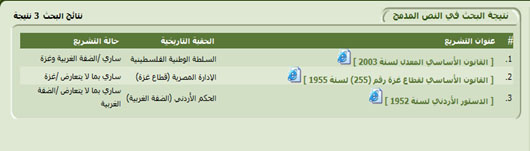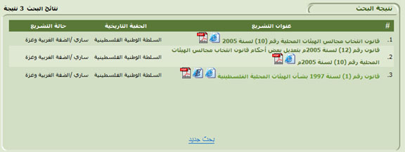 أما إذا اختار المستخدم من حقل نوع التشريع "قانون" ومن حقل التصنيف الموضوعي "الإدارة المحلية" ومن حقل الحقبة التاريخية "السلطة الوطنية"، وقام بالتأشير على أيقونة البحث في التشريعات السارية فقط والضغط على زر البحث، فإنه يكون قد اختار البحث في القوانين الصادرة في حقبة السلطة الوطنية في موضوع الإدارة المحلية السارية فقط، وستظهر النتائج وعددها (3) نتائج كما في الشكل التالي: