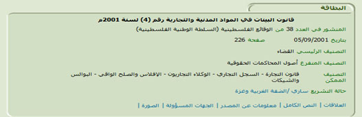 عند اختيار أي تشريع من صفحة النتائج، تظهر شاشة بطاقة التشريع، وتحتوي على المعلومات المرجعية الخاصة بالتشريع الأصلي كما هو مبين في الشكل التالي، حيث تعرض هذه البطاقة المعلومات التالية: