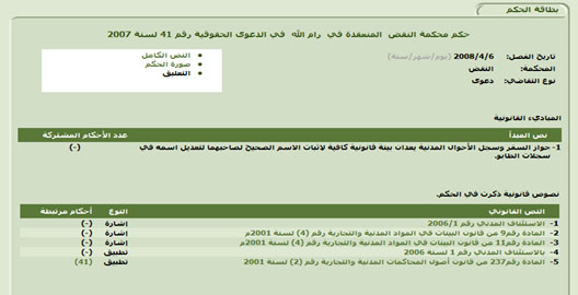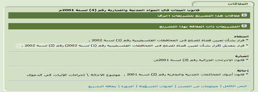 استحدث في النص الكامل خاصية الوصلات (hyperlink)، وهي خاصية تعمل على ربط الأحكام القضائيةبالتشريعات أو بالنصوص القانونيةبحيث تتيح إمكانية الوصول للتشريعات أو النصوص التي ذكرت في النص الكامل للحكم القضائي، فعند الضغط على الوصلةيمكن رؤية التشريع الذي ورد في الحكم كماينطبق أيضا ذلك على النصوصوعلي أية وثيقة تم تحديدها بوصلة: للتوضيح أنظر الشكل التالي: