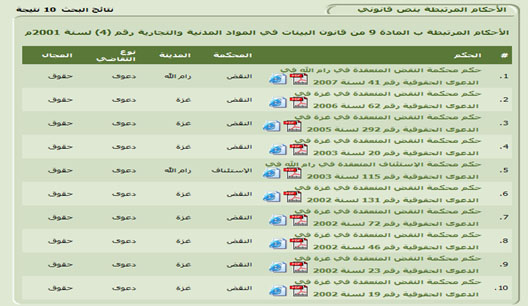 كما وتوفر قاعدة الربط ألمفاهيمي للمستخدم صلاحية الحصول على كافة المواد القانونية والأحكام القضائية التي عالجت المصطلح محل البحث، إذ يمكن للمستخدم من خلال الضغط على رقم المادة أو رقم الحكم الانتقال مباشرة إلى نص المادة أو الحكم القضائي.