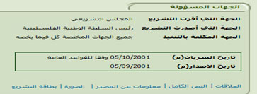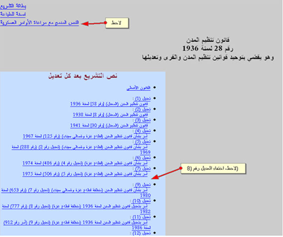 كما أن المربع الذي يظهر أعلى التشريع يبين التشريع بصورته الأصلية كما صدر دون أية تعديلات، ويشير أيضا إلى عدد التعديلات التي طرأت على التشريع ككل، كما هو مبين في الصورة التوضيحية التالية: