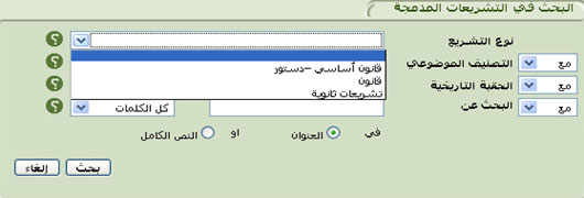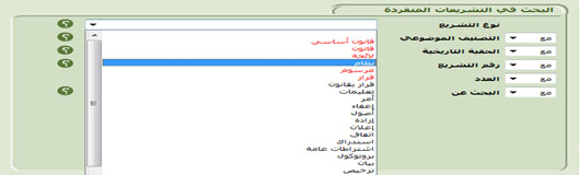 حيث يتم البحث من خلال هذا الحقل بمعرفة نوع التشريع المراد البحث عنه، ونورد أنواع التشريعات التاليةعلى سبيل المثال: