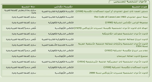 وتحتوي على التشريعات الخاصة بالأحوال الشخصية للطوائف المسيحية غير المنشورة في الجريدة الرسمية والتي استقلت بوضعها الطوائف المسيحية، أما تلك المنشورة رسميا في الجريدة الرسمية فيمكن البحث عنها من خلال التصنيف الموضوعي للتشريع كأي تشريع آخر.