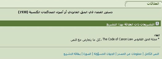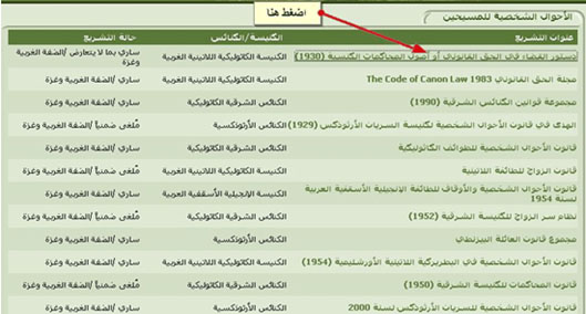 عملية عرض التشريعات الخاصة بالأحوال الشخصية للمسيحيين، تبدأ مباشرة دون المرور بشاشة بحث خاصة بها، وإنما يتم عرض النتائج مباشرة وذلك لمحدودية عددها، لاحظ الصورة: