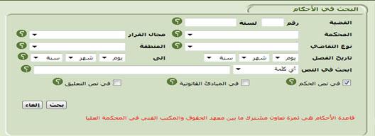 عند الدخول إلى واجهة البحث في الأحكام سوف تظهر مجموعة من الحقول كما هو مبين في الشكل التالي: