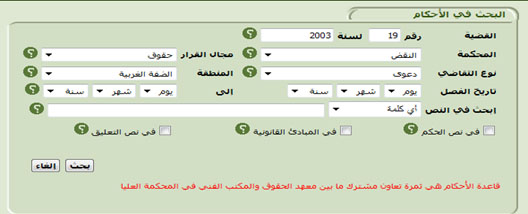 - المجال: على المستخدم أن يحدد مجال الحكم القضائي موضوع البحث فيما إذا كان حقوق أم جزاء أم إداري.