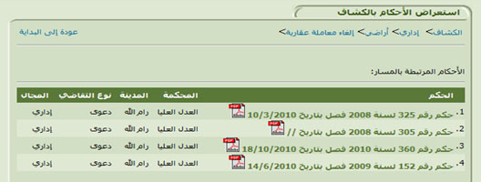 تتيح هذه الوصلة للمستخدم تصفح الأحكام القضائية المرتبطة بالحكم القضائي سواء أكانت أعلى درجة أم كانت أدنى درجة، وذلك بطريقة مباشرة من خلال الضغط على هذه الوصلة من بطاقة الحكم موضوع البحث ودون الحاجة إلى القيام بإجراء بحث جديد، كما هو مبين في الشكل التالي: