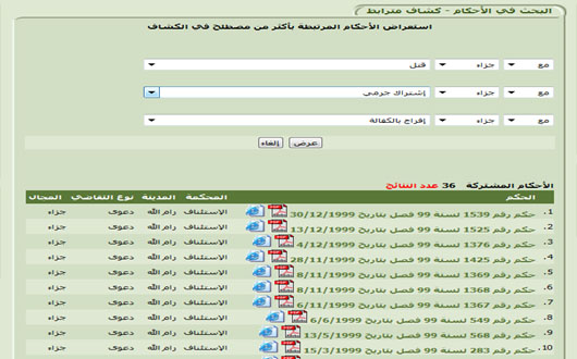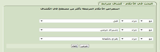 يمكن للمستخدم أن يختار في المستوى الأول داخل مجال الجزاء مصطلح (قتل) وفي المستوى الثاني داخل مجال الجزاء مصطلح (اشتراك جرمي) وفي المستوى الثالث داخل مجال الجزاء مصطلح (الإفراج بالكفالة)، كما هو مبين في الشكل التالي: