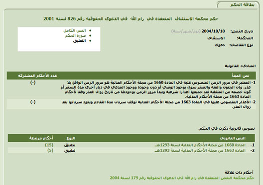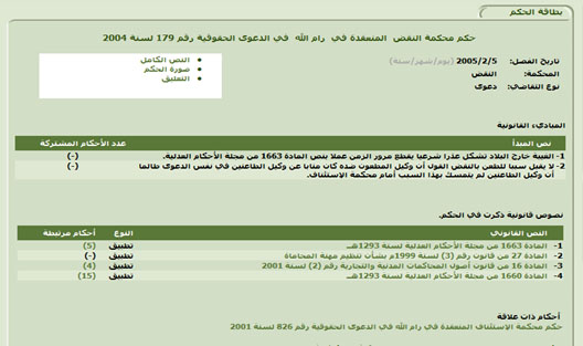 وعندما يقوم المستخدم بالضغط على المصطلحات ذات العلاقة، ينتقل إلى مصطلحات أخرى، كما لو قام بالضغط على مصطلح العجز، فينتقل إلى صفحة أخرى تتضمن أيضا علاقة هذا المصطلح بغيره من المصطلحات، وكذلك الأحكام القضائية والمواد القانونية ذات العلاقة به، وهكذا.