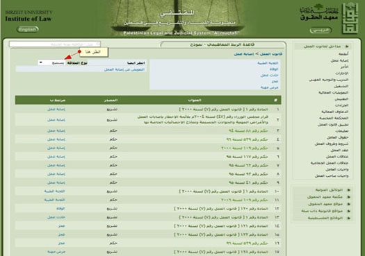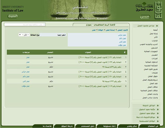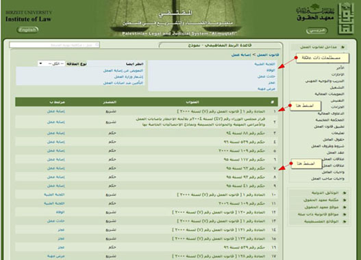و يمكن للمستخدم من خلال الضغط على أي مصطلح من المصطلحات الحصول على كل ما يتعلق به من علاقات وتشريعات وأحكام قضائية، فمثلا لو أراد المستخدم البحث في مصطلح إصابة العمل، يقوم بالضغط على المصطلح فتظهر له قائمة بالمصطلحات ذات العلاقة بمصطلح إصابة العمل، كما وتظهر له قائمة بالمواد القانونية التي نظمت هذا المصطلح، إضافة إلى الأحكام القضائية التي عالجته بشكل أساسي.